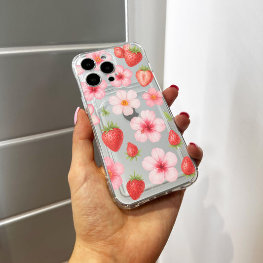 Hibiscus Flower Strawberry Card Holder Phone Case for iPhone 17 16 15 14 13 12 11 11 Pro Max Mini 7 8 XR X Wallet Shockproof Phone Cover