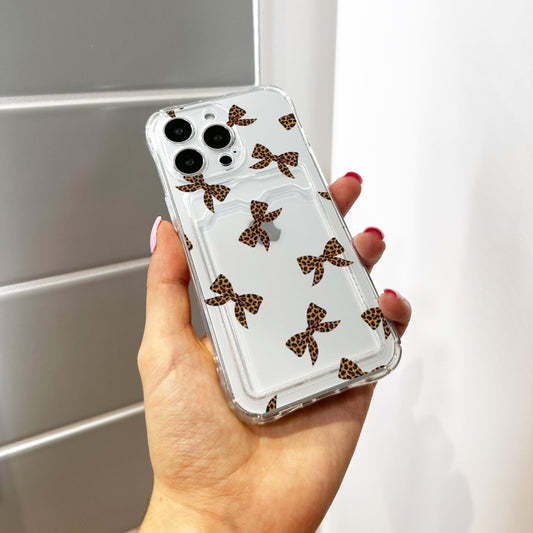 Leopard Print Bow Card Holder Phone Case for iPhone 17 16 15 14 13 12 11 11 Pro Max Mini 7 8 XR X Wallet Shockproof Phone Cover Custom Name