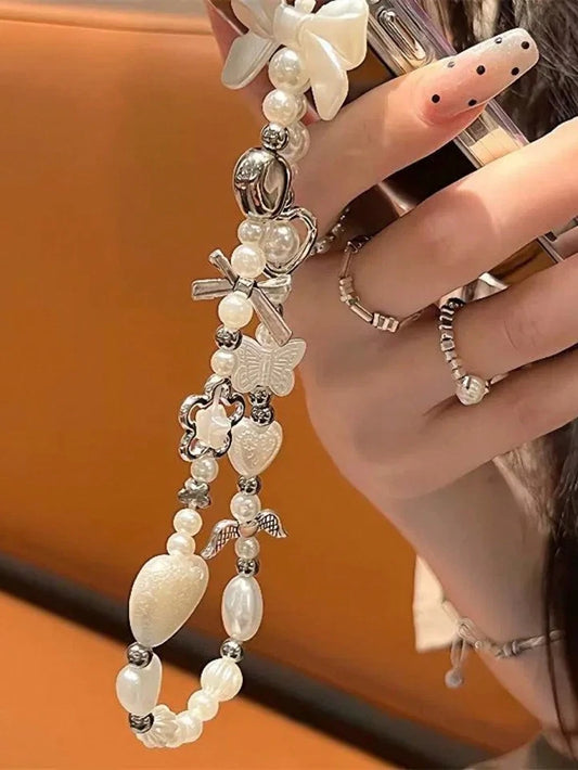 Pearl Heart Butterfly Beaded Phone Charm Wrist Strap Chain Cute Accessory Keys