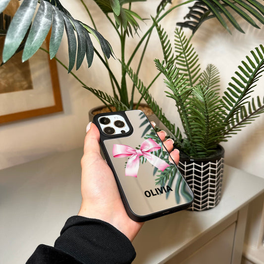 Personalised Name Pink Bow Mirror Phone Case for iPhone 15 14 13 12 11 11 Pro Max Mini 7 8 XR XS X Shockproof Phone Cover With Ribbon