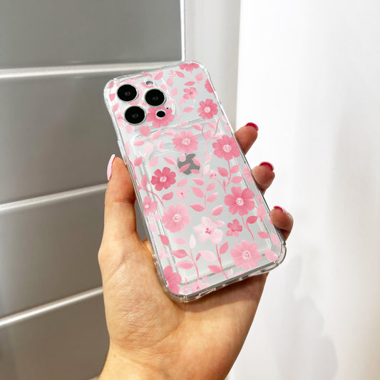 Pink Floral Pattern Card Holder Phone Case for iPhone 17 16 15 14 13 12 11 Pro Max Mini 7 8 XR Wallet Shockproof Phone Cover Custom Name