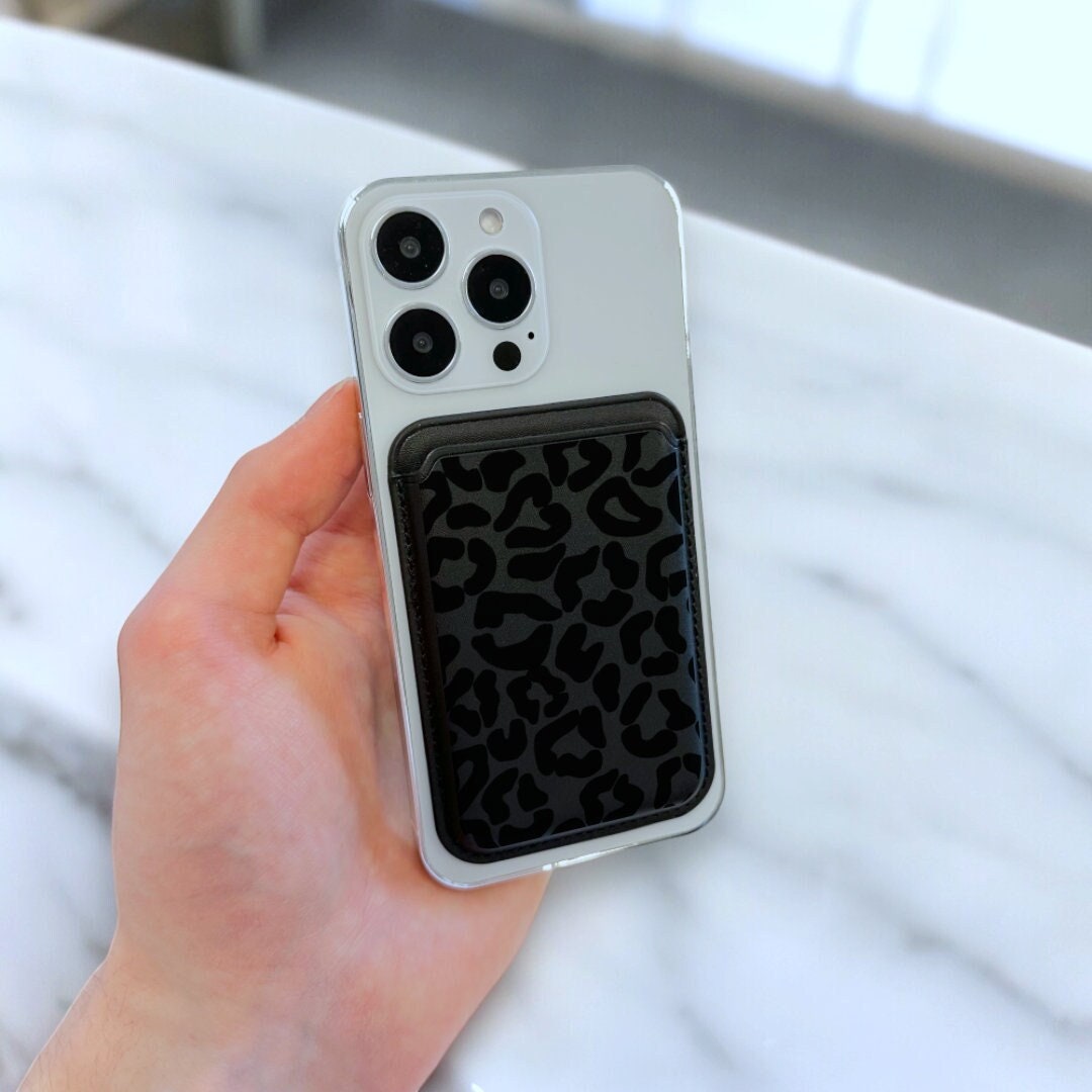 Black Leopard Print MagSafe Wallet Vegan Leather MagSafe Wallet for iPhone 15 14 13 12 Magnetic iPhone Card Holder with Personalised Name