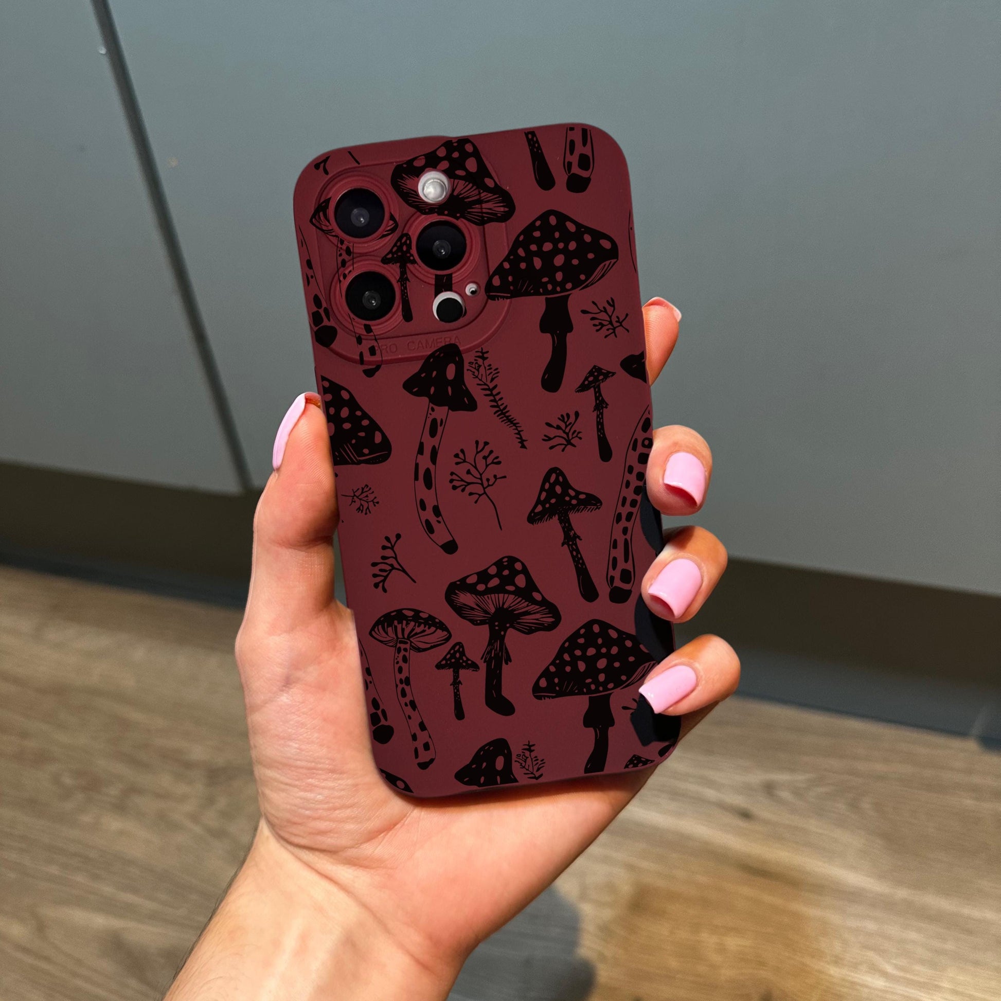 Black Mushroom Funky Burgundy Phone Case for iPhone 17 16 15 14 13 12 11 11 Pro Max Mini 7 8 XR XS X Shockproof Phone Cover with Custom Name