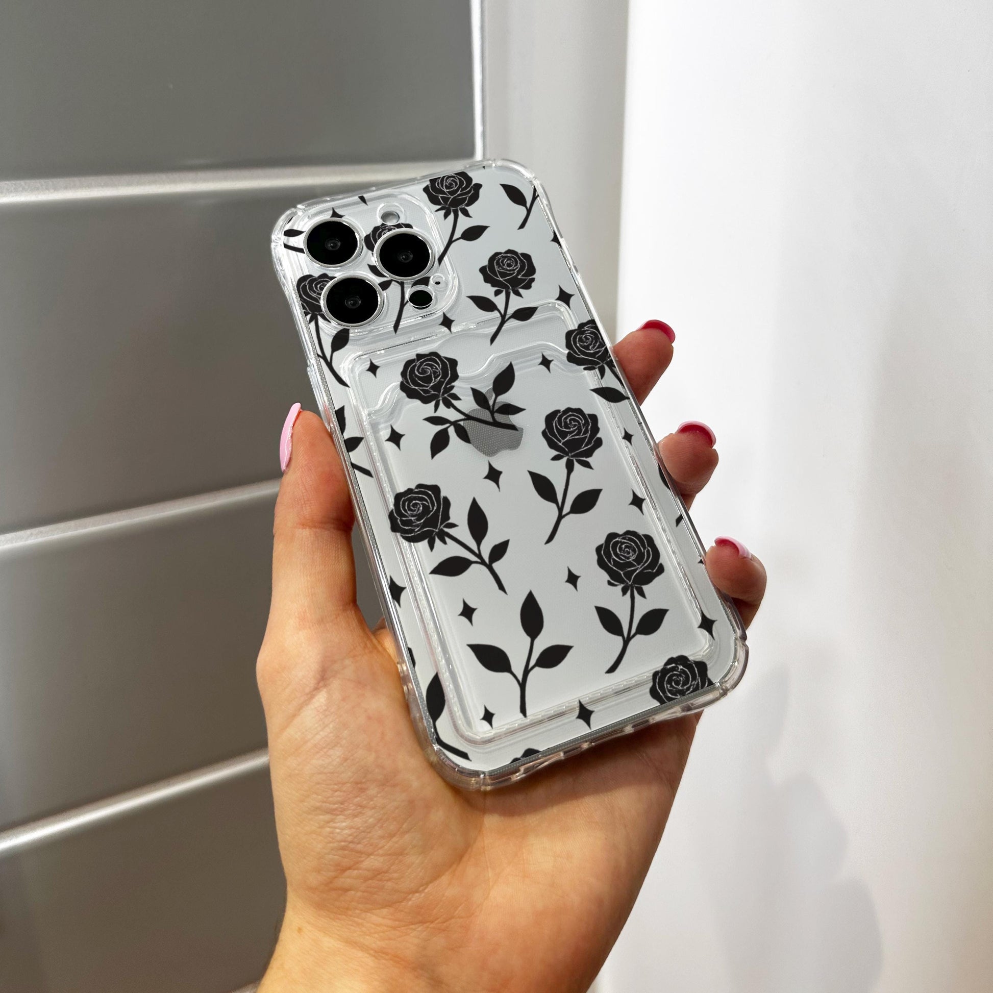 Black Rose Silhouettes Pattern Card Holder Phone Case for iPhone 17 16 15 14 13 12 11 11 Pro Max Mini 7 8 XR Wallet Shockproof Phone Cover