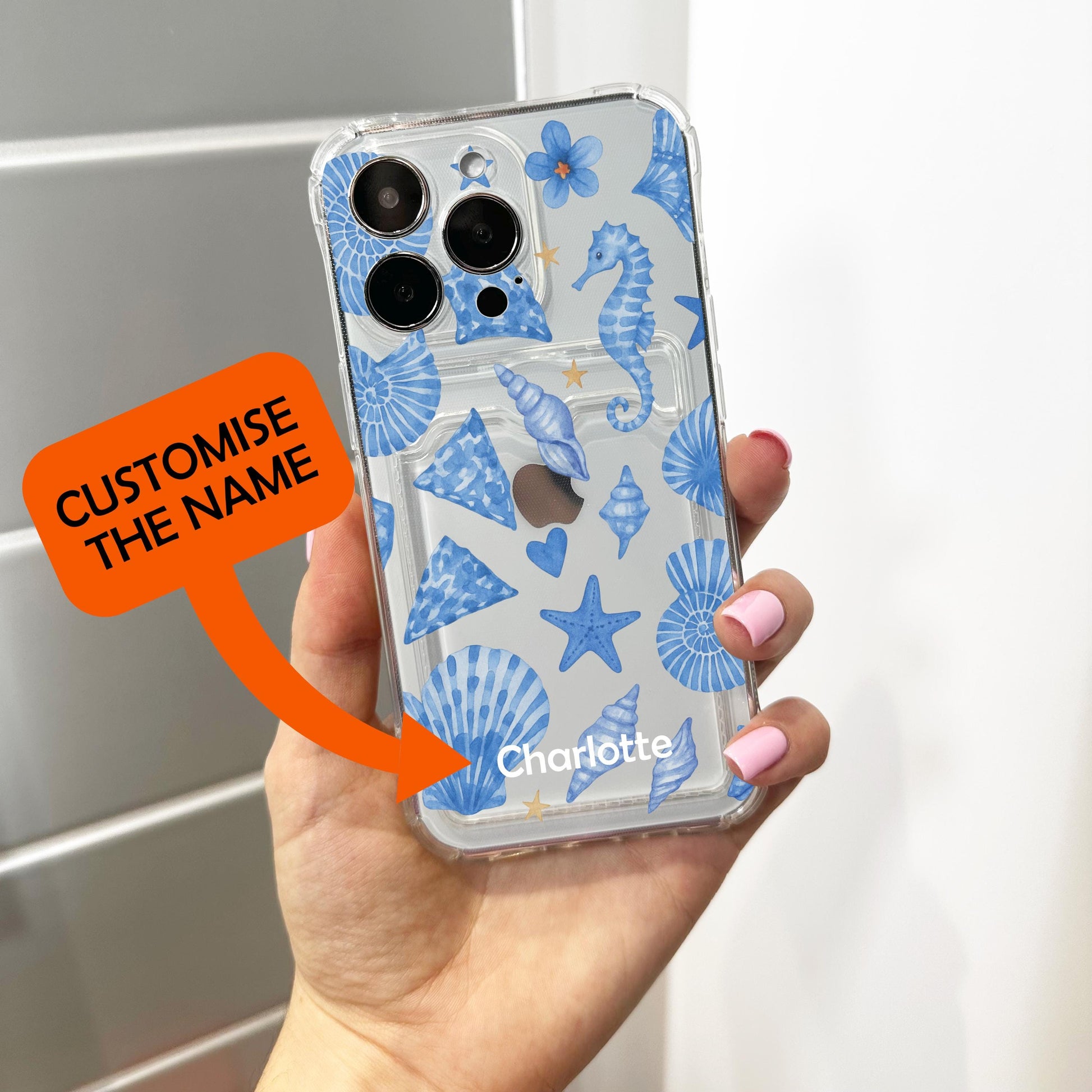 Blue Beach Theme Sea Horse Shell Pattern Clear Card Holder Phone Case for iPhone 17 16 15 14 13 12 11 11 Pro Max Mini Wallet Shockproof Case