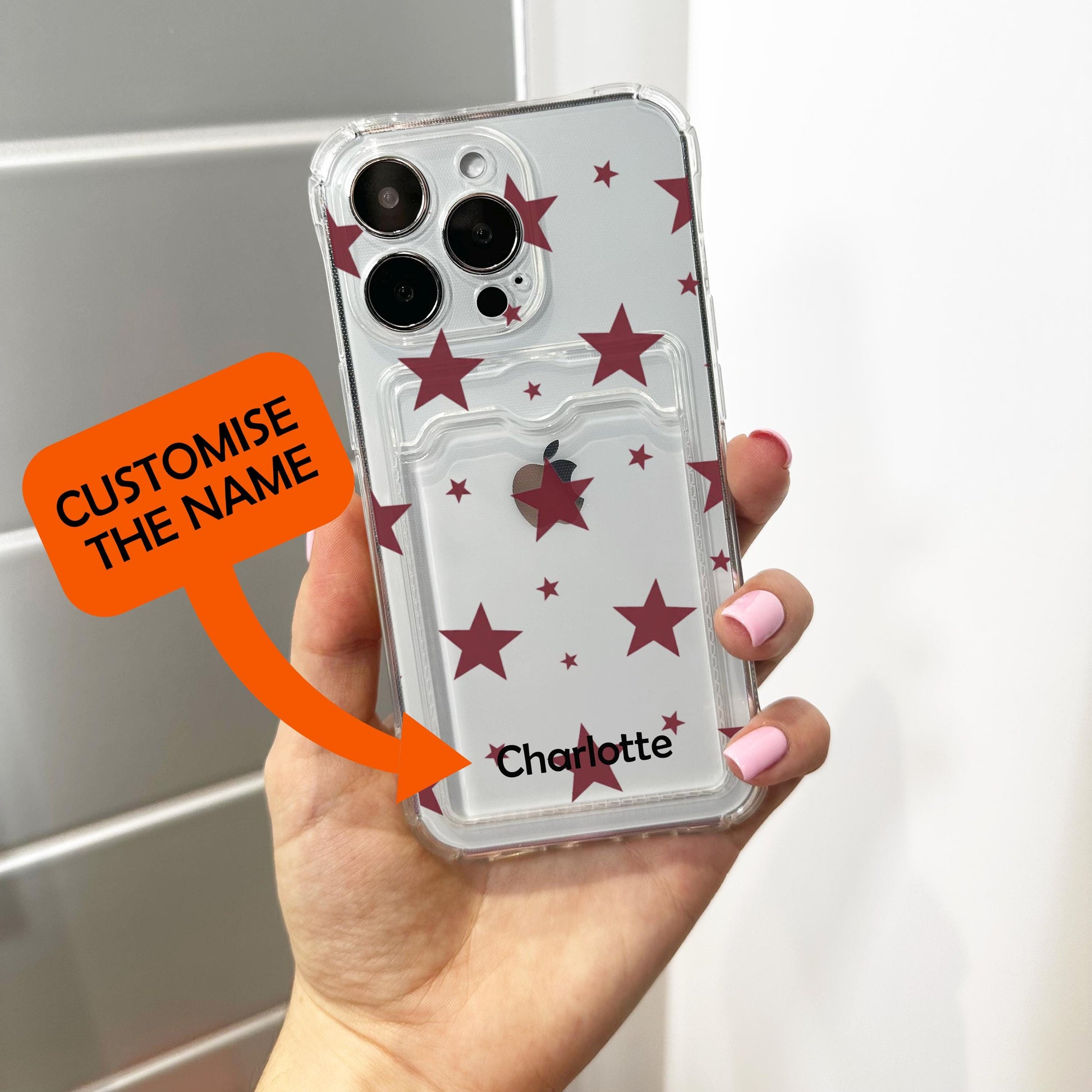 Burgundy Star Clear Card Holder Phone Case for iPhone 17 16 15 14 13 12 11 11 Pro Max Mini 7 XR X Wallet Shockproof Phone Cover Custom Name
