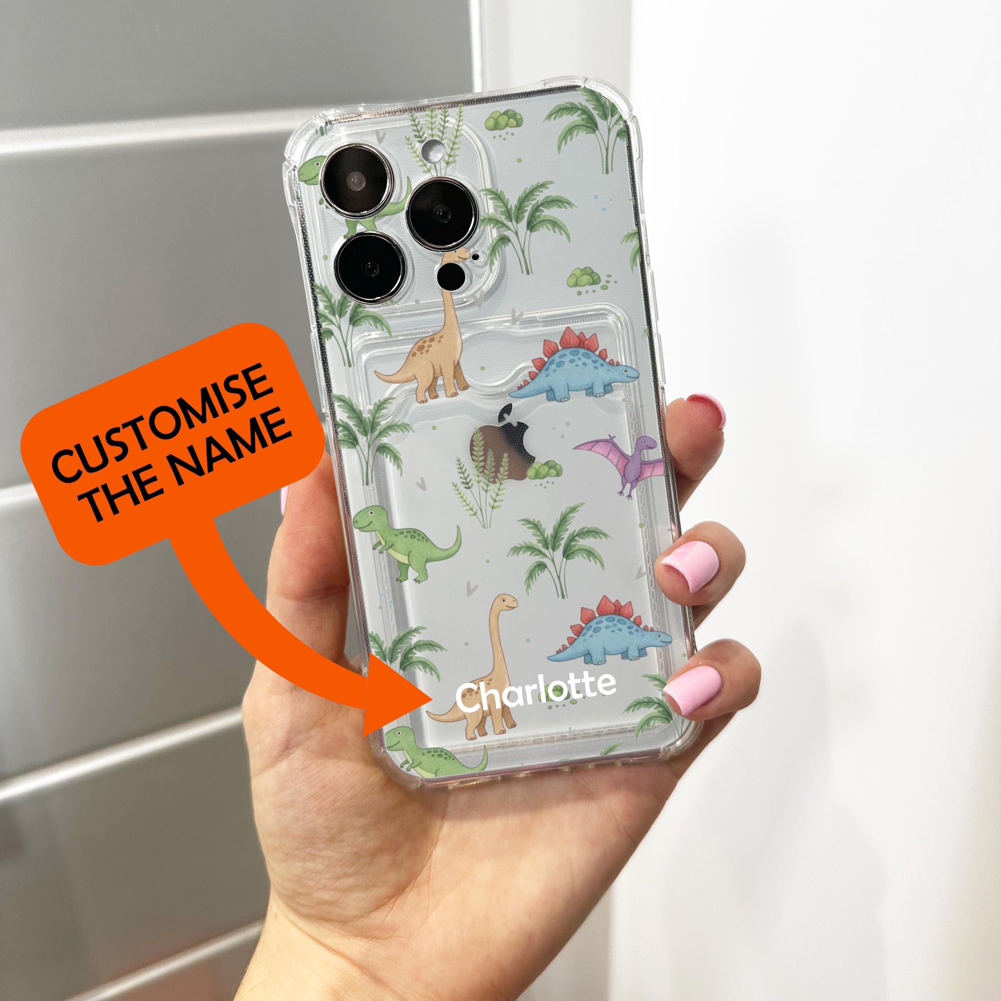 Cartoon Dinosaur Card Holder Phone Case for iPhone 17 16 15 14 13 12 11 11 Pro Max Mini 7 XR XS X Wallet Shockproof Phone Cover Custom Name