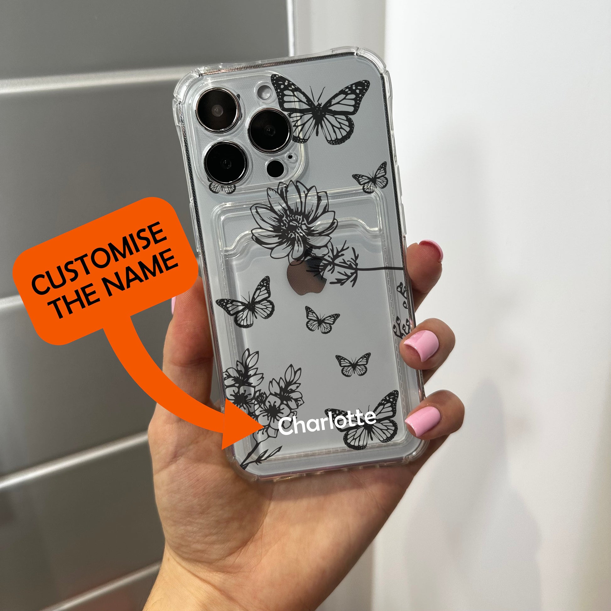 Floral Butterfly Card Holder Phone Case for iPhone 17 16 15 14 13 12 11 11 Pro Max Mini 7 8 XR XS X Shockproof Phone Cover with Custom Name
