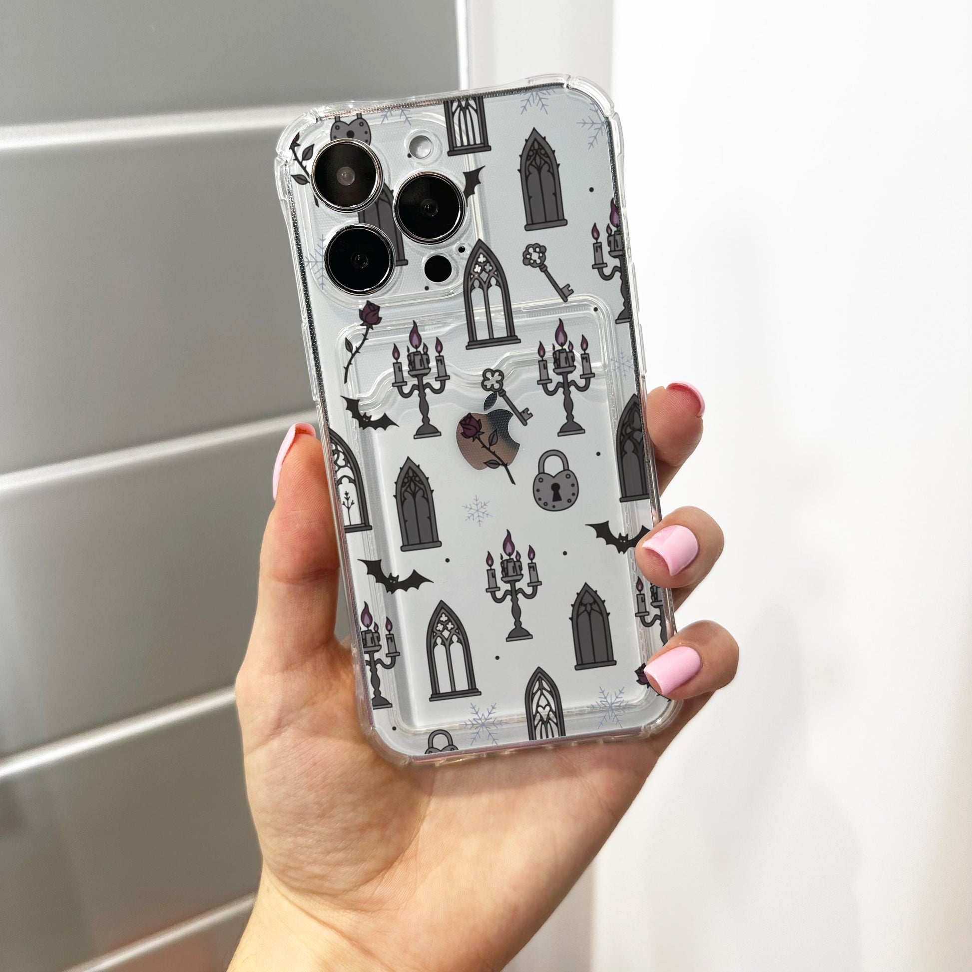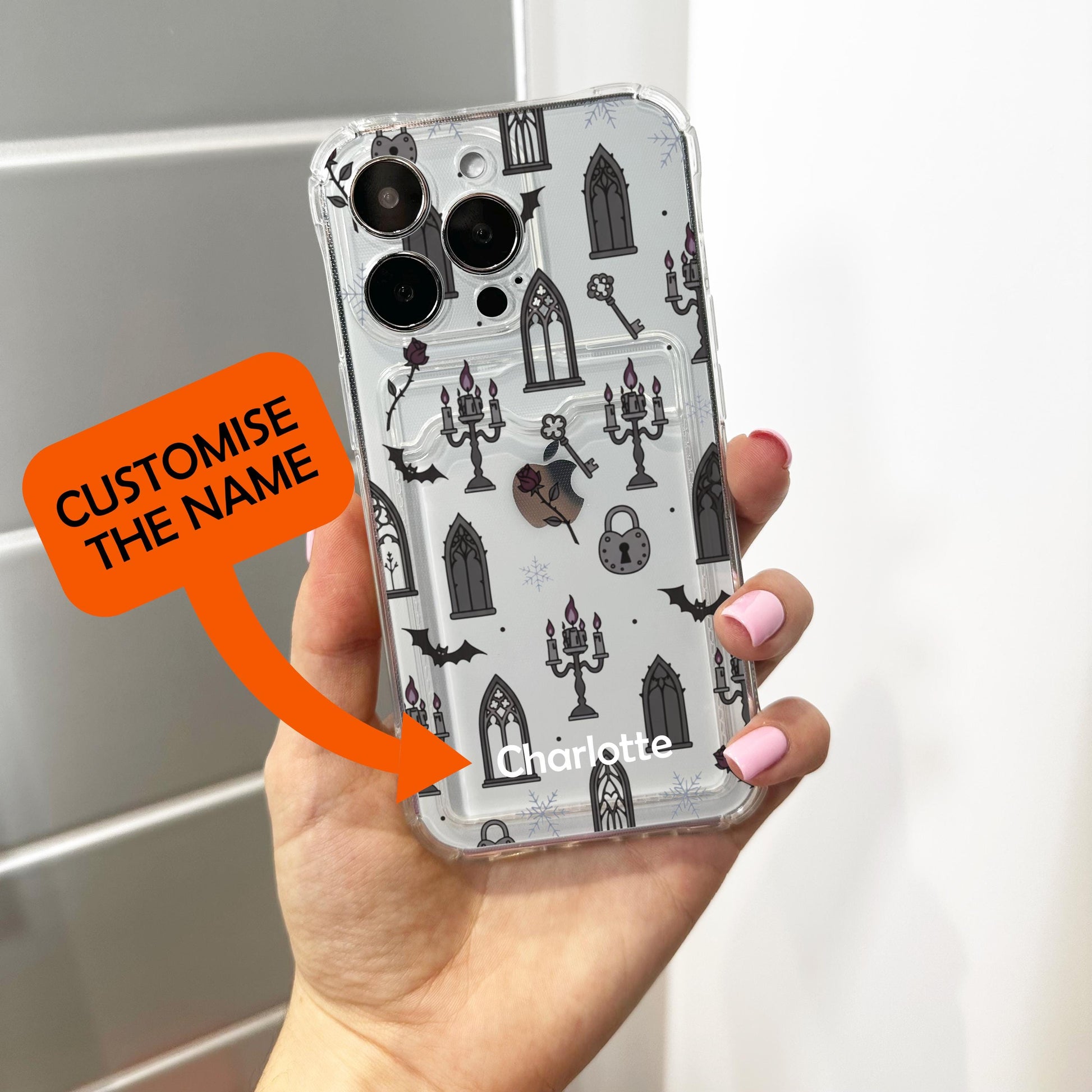 Gothic Halloween Card Holder Phone Case for iPhone 17 16 15 14 13 12 11 11 Pro Max Mini 7 8 XR X Wallet Shockproof Phone Cover Custom Name
