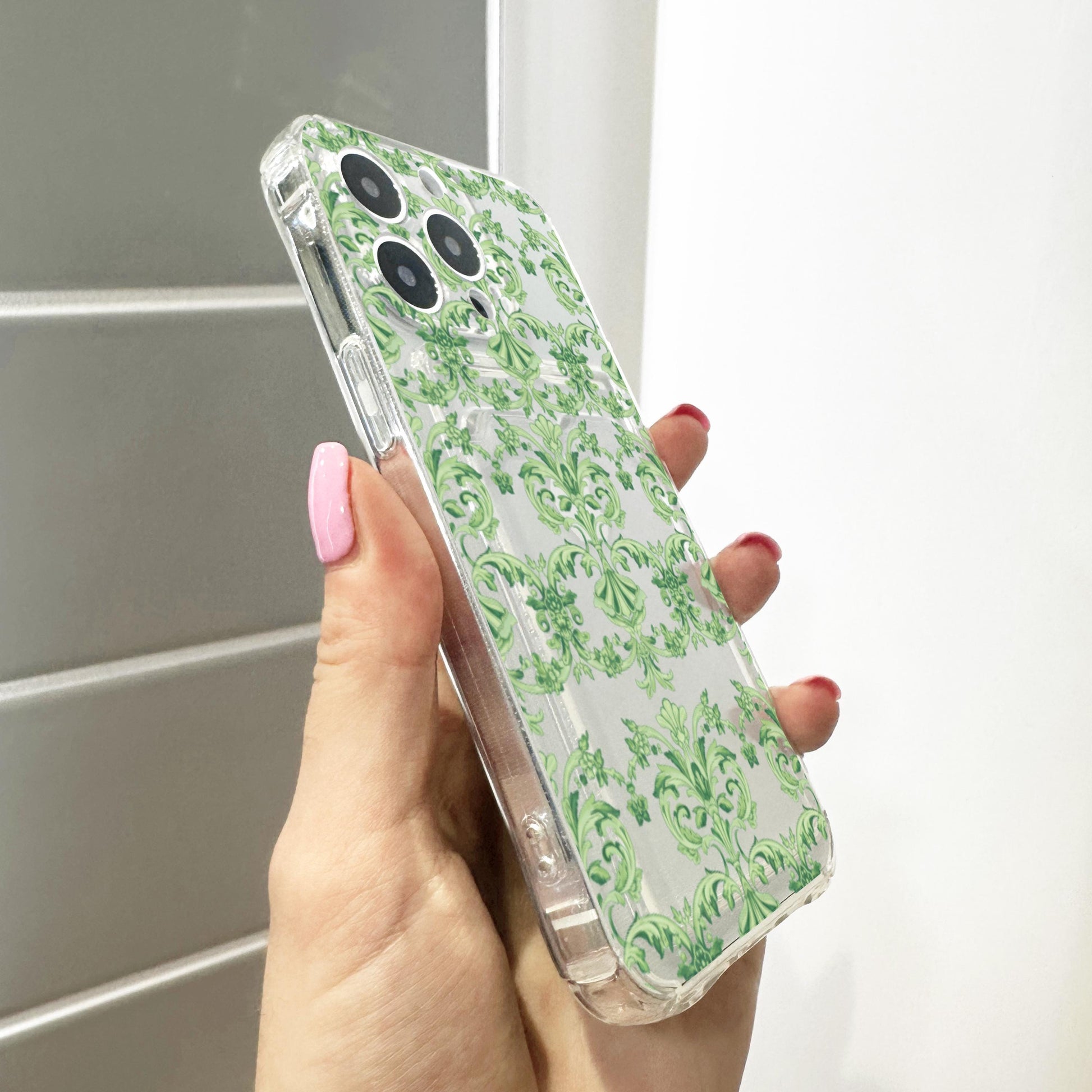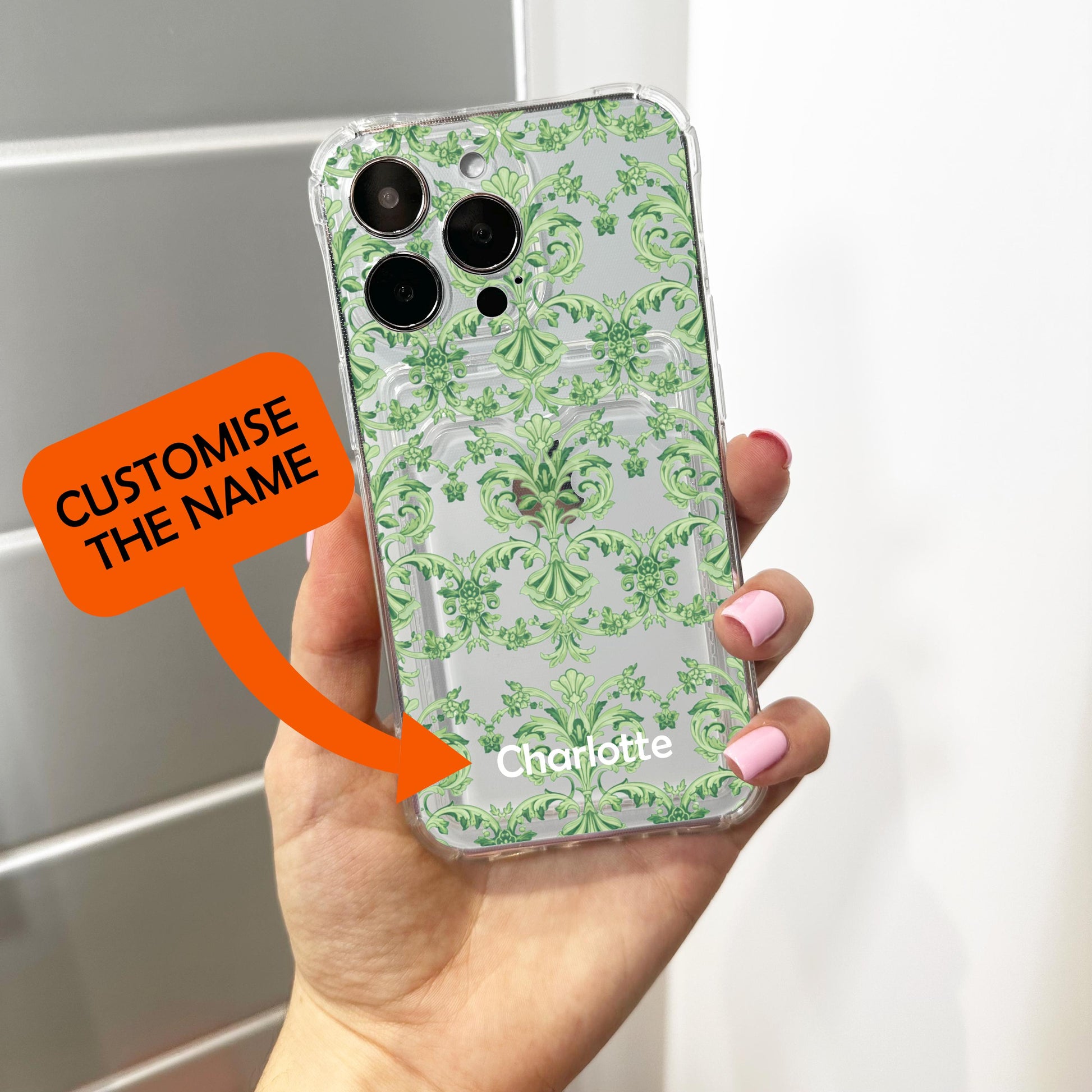 Green Baroque Revival Card Holder Phone Case for iPhone 17 16 15 14 13 12 11 11 Pro Max Mini 7 XR Wallet Shockproof Phone Cover Custom Name