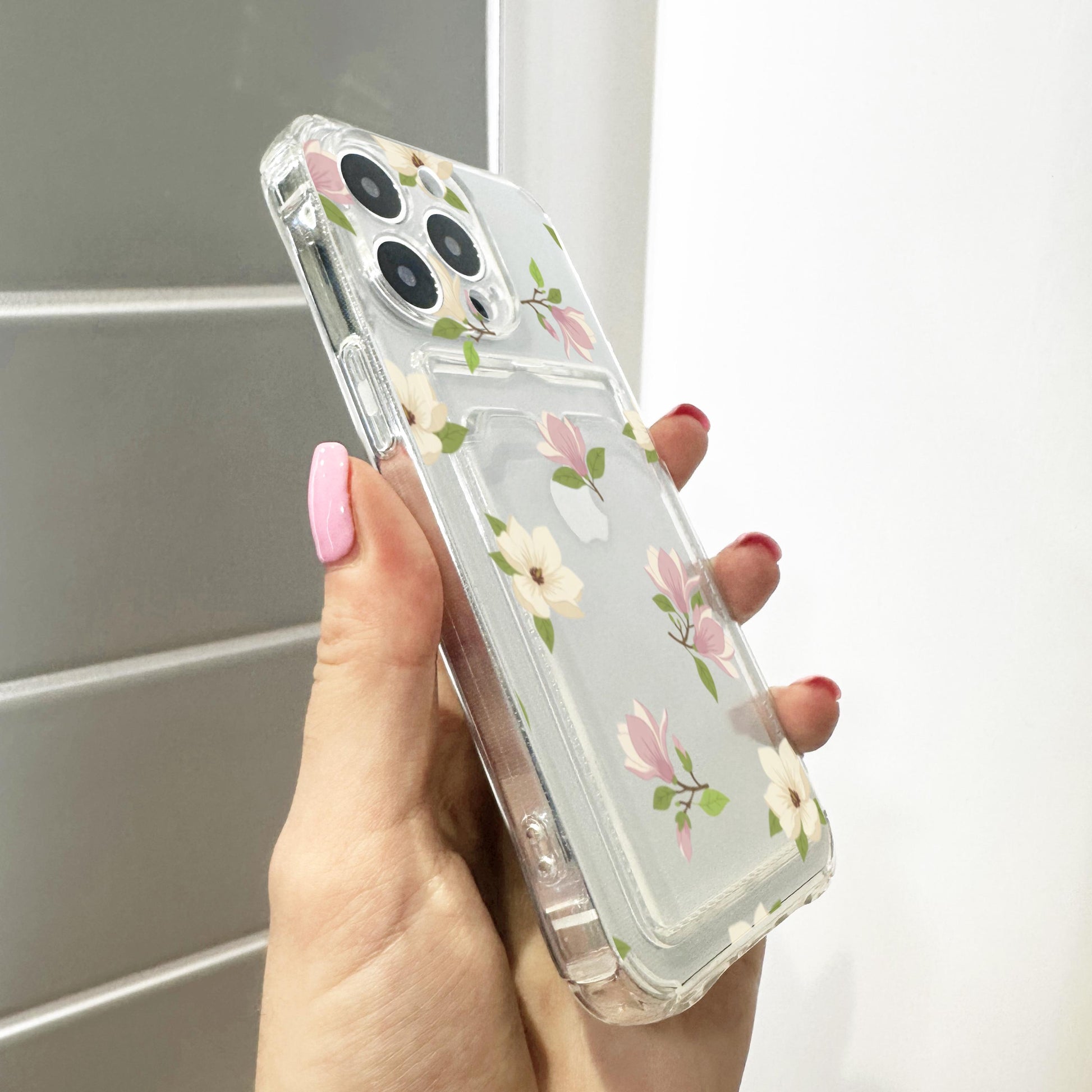 Magnolia Flower Clear Card Holder Phone Case for iPhone 17 16 15 14 13 12 11 11 Pro Max Mini 7 8 XR X Wallet Shockproof Phone Cover Custom