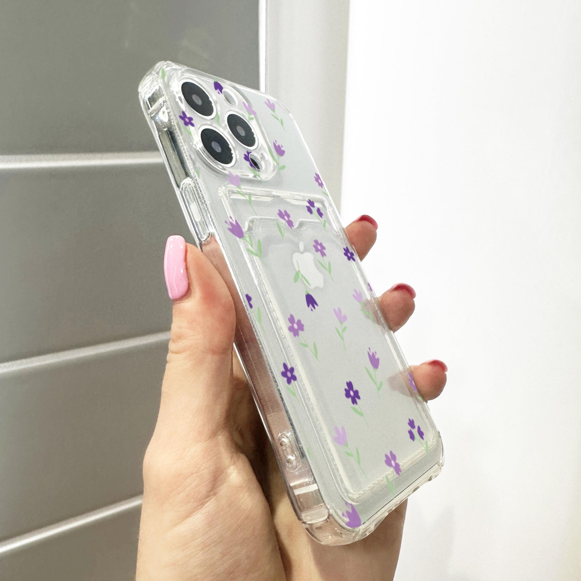 Purple Floral Flower Clear Card Holder Phone Case for iPhone 17 16 15 14 13 12 11 11 Pro Max Mini 7 XR Wallet Shockproof Phone Cover Custom