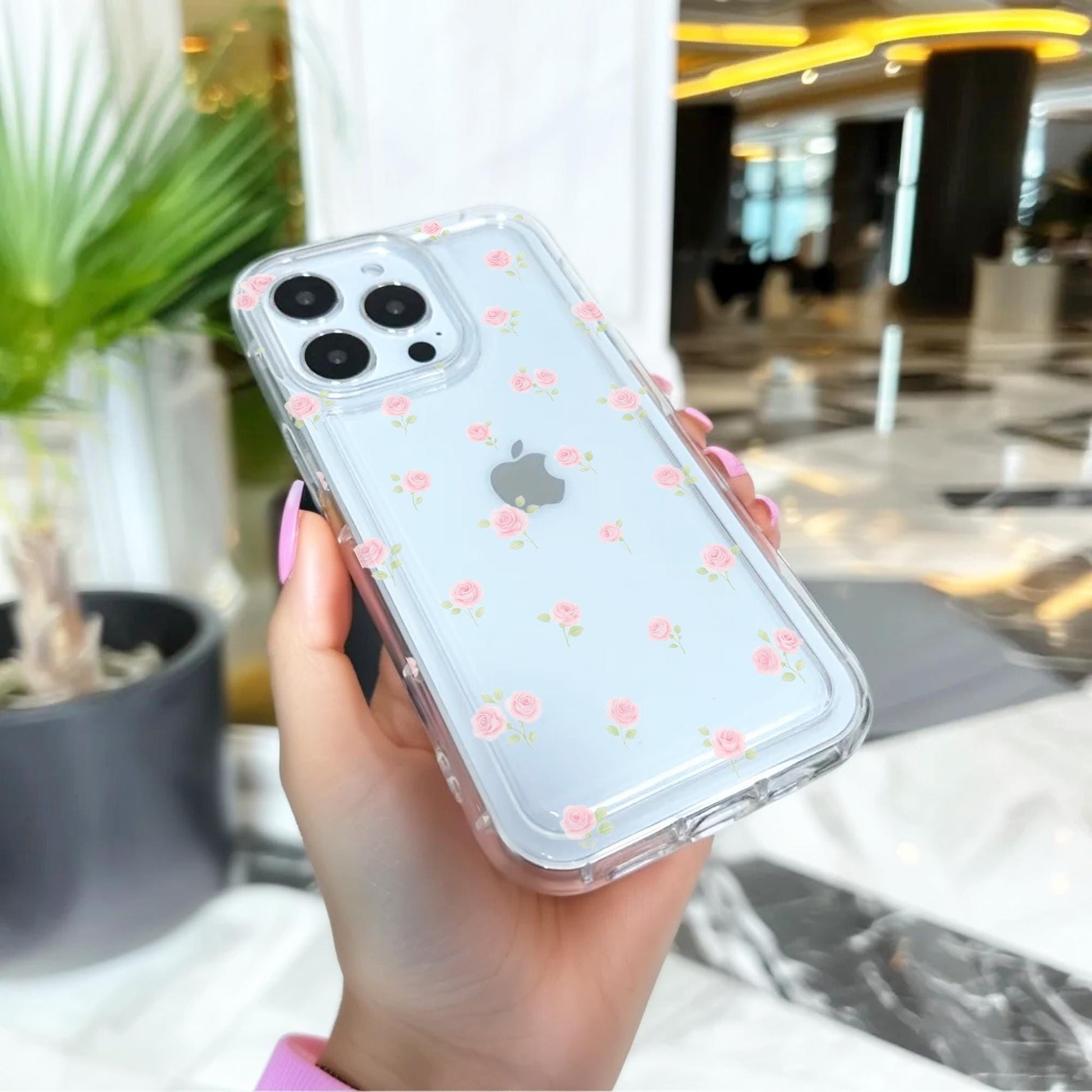 Small Pink Rose Floral Clear Phone Case for iPhone 16 15 14 13 12 11 11 Pro Max Mini 7 8 XR Shockproof Silicone Phone Cover with Custom Name
