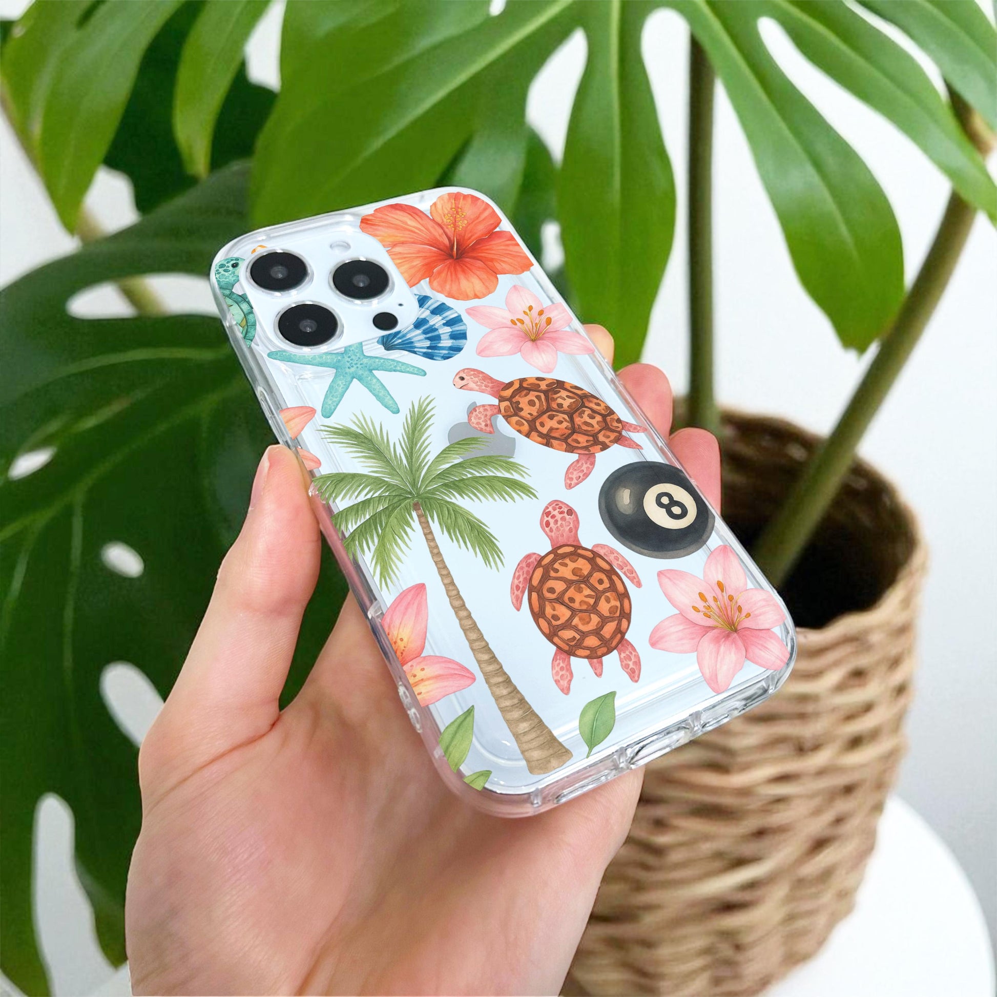 Summer Turtle Shell Hibiscus Flower Clear Phone Case for iPhone 17 16 15 14 13 12 11 11 Pro Max Mini 7 8 XR X Shockproof Cover Custom Name